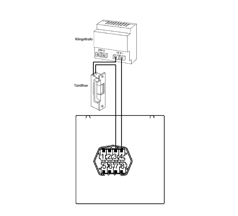 Schaltausgang 3/4 schaltet potentialfrei, d.h. für einen Standard-Türöffner ist ein separater Klingeltrafo erforderlich.